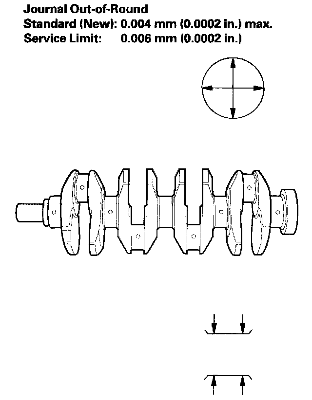 4. Measure the out-of-round at the middle of each rod and main journal in two places of the cross direction. The difference between measurements on each journal must not be more than the service limit.