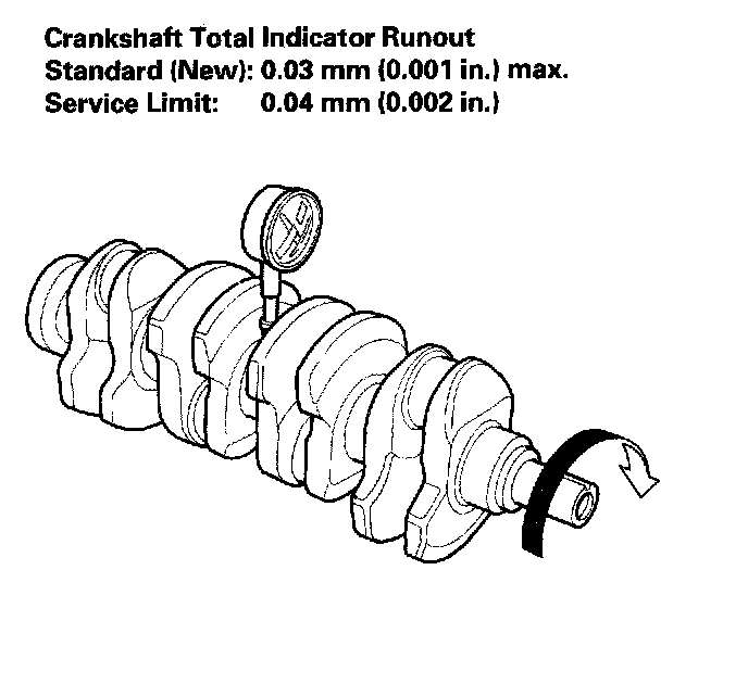 9. Measure the runout on all of the main journals. Rotate the crankshaft two complete revolutions. The difference between measurements on each journal must not be more than the service limit.