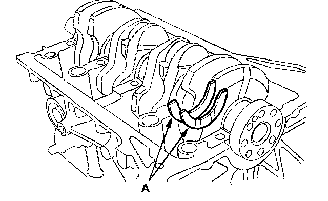 6. Install the thrust washers (A) on both edges of the No. 4 main bearing recess.