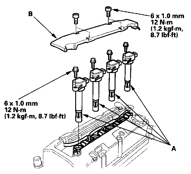 8. Install the ignition coils (A), then install the ignition coil cover (B).