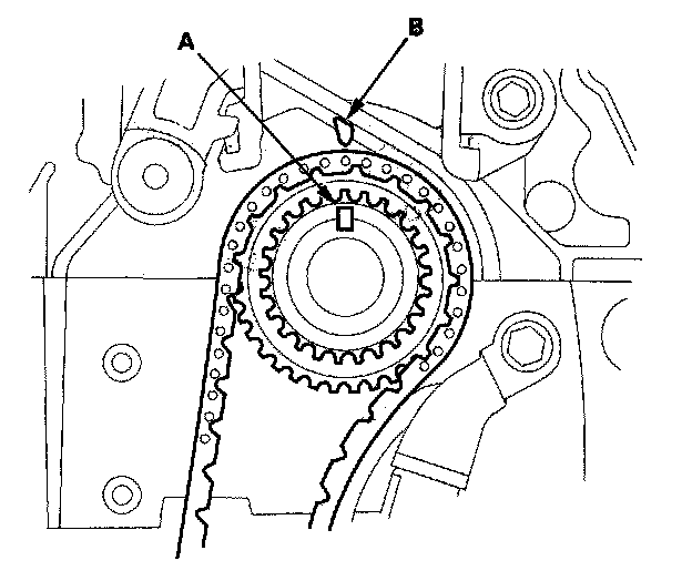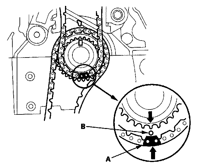 1. Set the crankshaft sprocket so that the No.1 Piston is at Top Dead Center (TDC). Align the key (A) on the sprocket and crankshaft with the pointer (B) on the engine block.