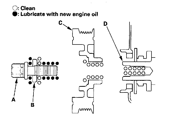 12. Clean the bolt (A), washer (B), pulley (C), and crankshaft (D). Lubricate with new engine oil as shown.