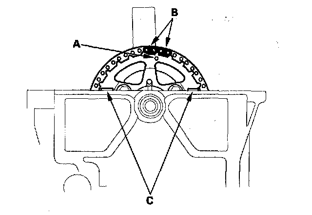 28. Turn the assembly counterclockwise to relieve cam chain free play, and check the alignment of the TDC marks (C) on the cam chain sprocket with the cylinder head surface. If the cam chain sprocket is not positioned at TDC, remove the assembly from the cylinder head and reposition the cam chain to bring the cam chain sprocket to TDC.