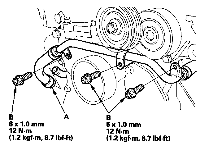 59. Install the water bypass hose (A), and tighten the three bolts (B) securing the water bypass tube.