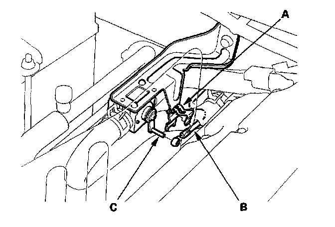 Heater Valve Cable Adjustment1. From under the hood, open the cable clamp (A), then disconnect the heater valve cable (B) from the heater valve arm (C).