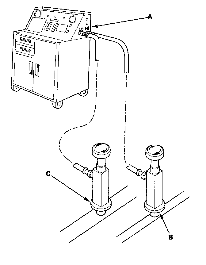1. Connect a R-134a refrigerant recovery/recycling/charging station (A) to the high-pressure service port (B) and the low-pressure service port (C), as shown, following the equipment manufacturer's instructions.