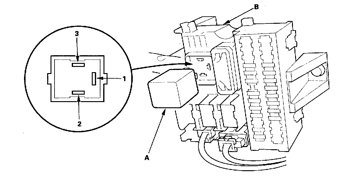 Turn Signal/Hazard Relay Input Test1. Remove the turn signal/hazard relay (A) from the under-dash fuse/relay box (B).