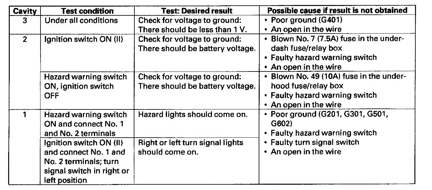 - If all the input tests prove OK, the turn signal/hazard relay must be faulty; replace it.