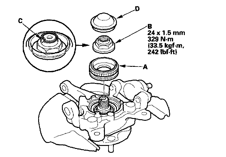 30. Apply a small amount of engine oil to the seating surface of a new spindle nut (B). Install the nut, and tighten it to the specified torque value. Stake (C) the nut shoulder against the driveshaft with a drift.