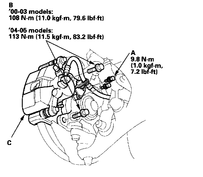4. Remove the caliper bracket mounting bolts (B), and remove the caliper assembly (C) from the knuckle. To prevent damage to the caliper assembly or brake hose, use a short piece of wire to hang the caliper assembly from the undercarriage. Do not twist the brake hose with force.