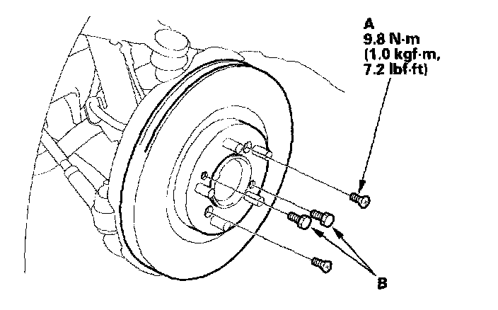 7. Screw two 8 x 1.25 mm bolts (B) into the disc to push it away from the hub. Turn each bolt two turns at a time to prevent cocking the disc excessively.