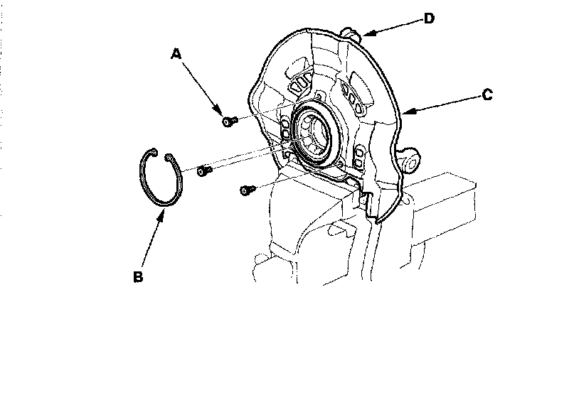 20. Remove the screws (A), snap ring (B), and the splash guard (C) from the knuckle (D).
