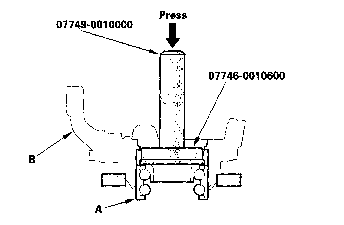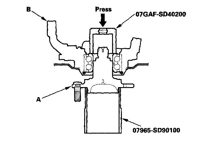 28. Install the hub (A) onto the knuckle (B) using the special tools and a hydraulic press. Take care not to deform the splash guard.