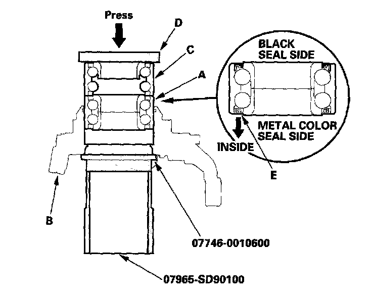24. Press a new wheel bearing (A) into the knuckle (B) using the old bearing (C), a steel plate (D), the special tool, and a press. Place the wheel bearing on the knuckle with the pack seal side facing (E) (metal color) toward the inside. Be careful not to damage the sleeve of the pack seal.