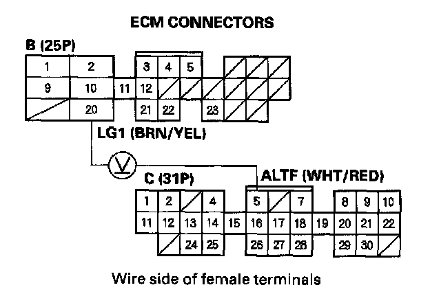 7. Measure voltage between ECM connector terminals B20 and C5.