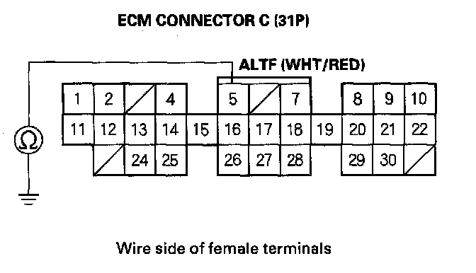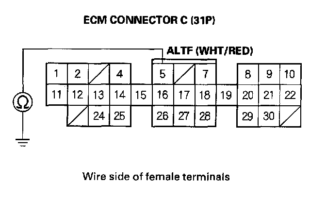 15. Check for continuity between body ground and ECM connector terminal C5.