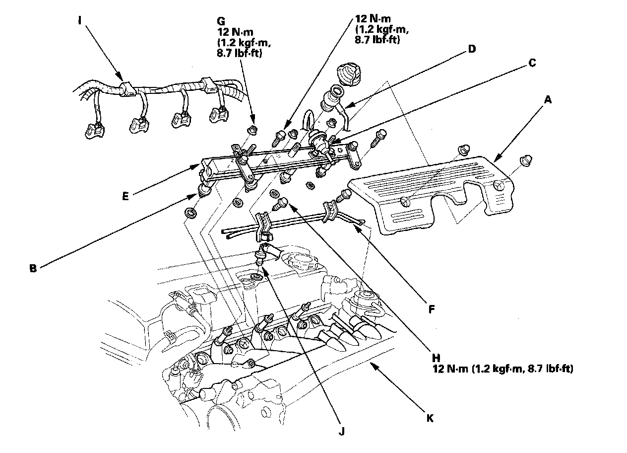 5. Remove the retainer nuts (G) and bolts (H) from the fuel rail and harness holder (I).