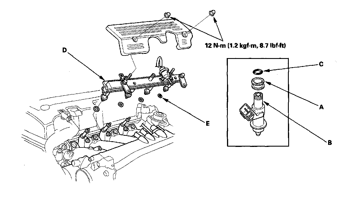 2. Remove the fuel rail cover (A), then disconnect the connectors from the injectors (B).