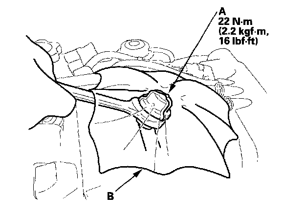 6. Place a rag or shop towel (B) over the fuel pulsation damper.