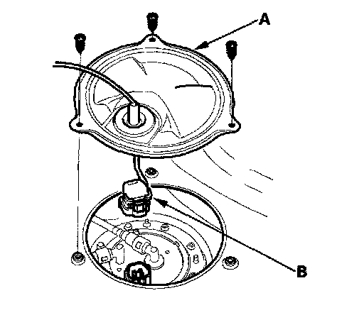 7. Remove the access panel (A) from the floor, and disconnect the fuel tank 5P connector (B).