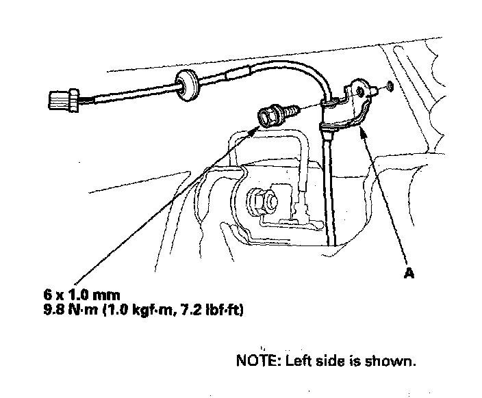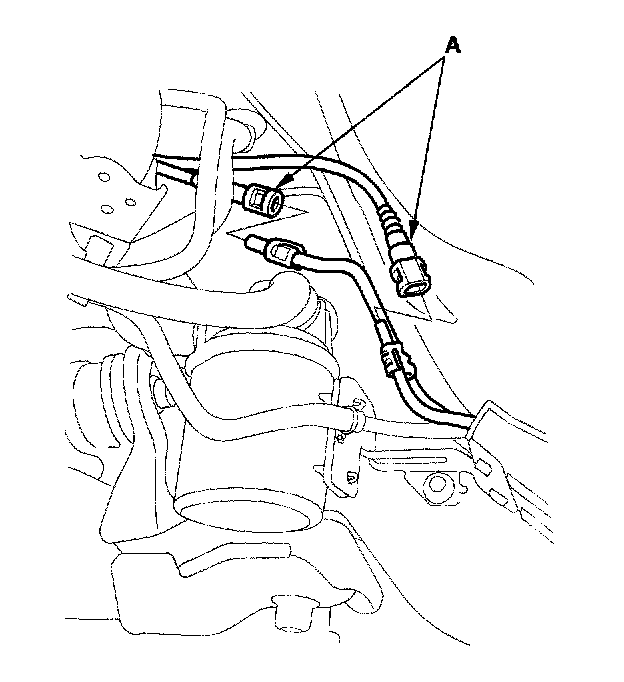 12. Remove the bolts from both ABS rear wheel sensor harness brackets (A).