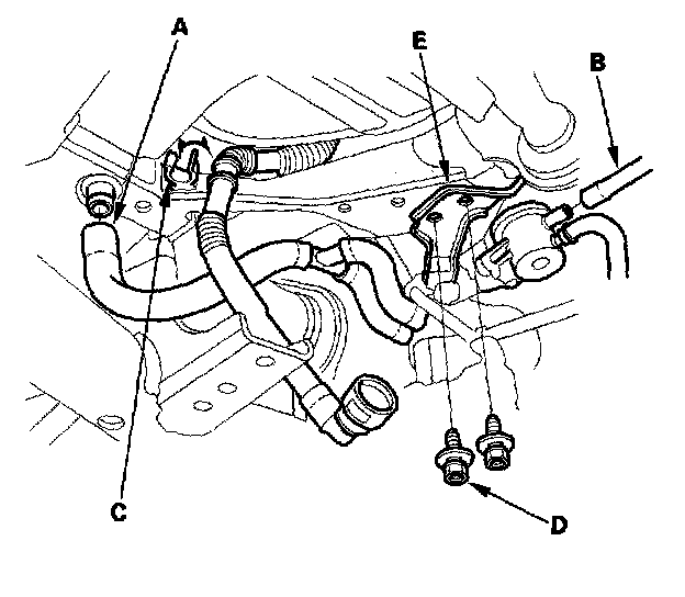 21. Disconnect the hose (A) and fuel vent tube (B), then remove the fuel tank vapor vent tube from the tube holder (C). Remove the bolts (D) and the fuel vent assembly (E).