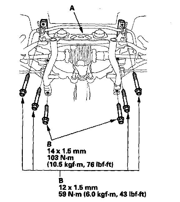 22. Place a jack or other support under the rear suspension subframe (A). Remove the mounting bolts (B) and the rear suspension subframe (A).