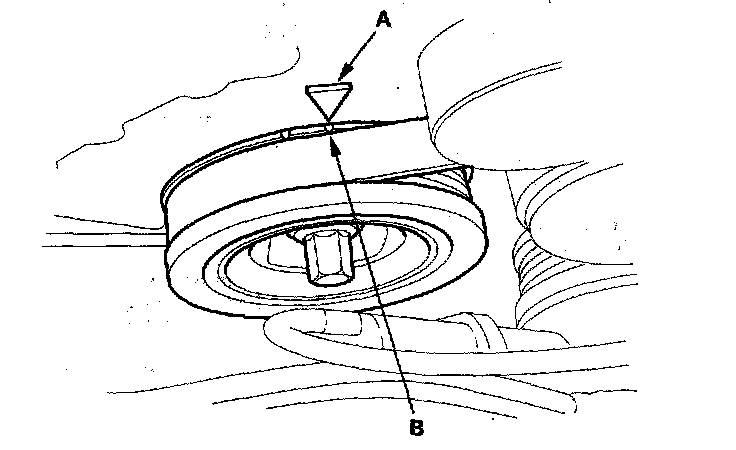 6. Aim the light toward the pointer (A). Check the ignition timing under a no load condition: