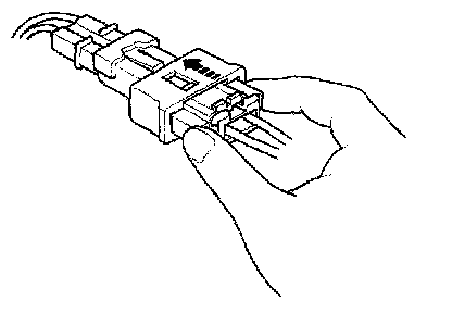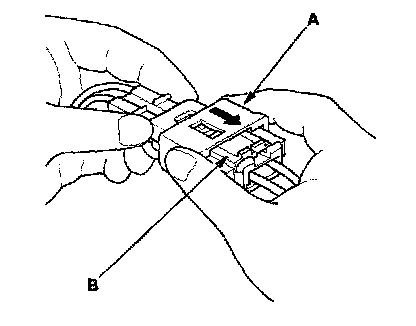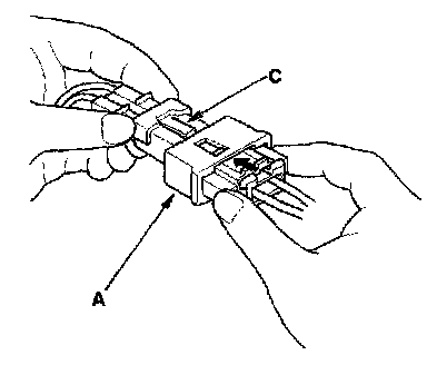 1. To reconnect, hold the pawl-side connector, and press on the back of the sleeve-side connector in the direction shown. As the two connector halves are pressed together, the sleeve (A) is pushed back by the pawl (C). Do not touch the sleeve.