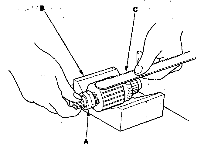 9. Place the armature (A) on an armature tester (B). Hold a hacksaw blade (C) on the armature core. If the blade is attracted to the core or vibrates while the core is turned, the armature is shorted. Replace the armature.