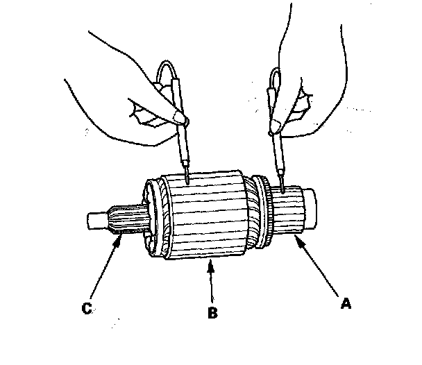 10. Check with an ohmmeter for continuity between the commutator (A) and armature coil core (B), and between the commutator and armature shaft (C). If there is continuity, replace the armature.