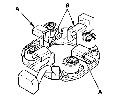 14. Check for continuity between the (+) brush holder (A) and (-) brush holder (B). If there is continuity, replace the brush holder assembly.