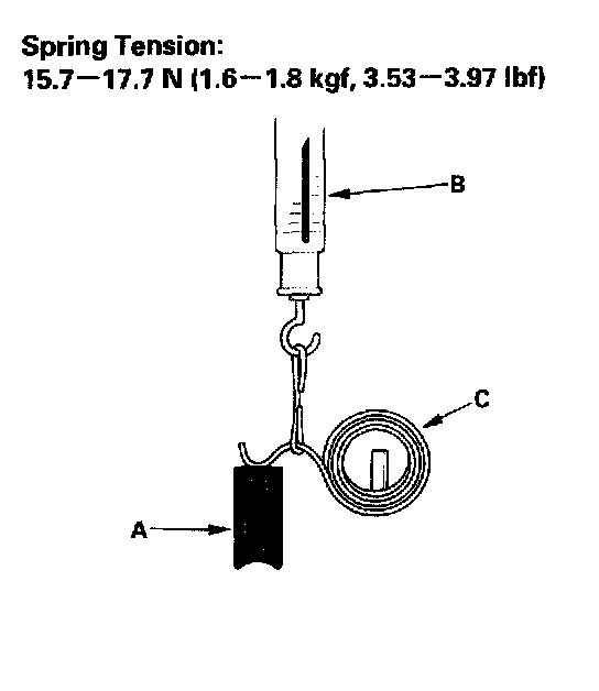 15. Insert the brush (A) into the brush holder, and bring the brush into contact with the commutator, then attach a spring scale (B) to the spring (C). Measure the spring tension at the moment the spring lifts off the brush. If the spring tension is not to specification, replace the spring.