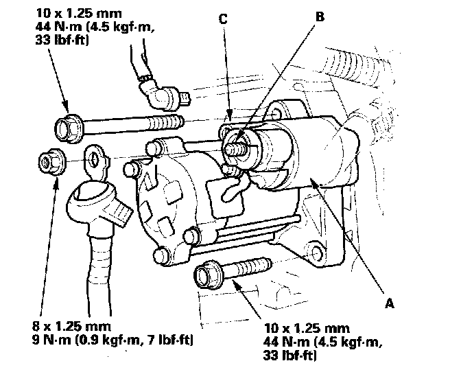 7. Disconnect the starter cable from the B terminal on the starter solenoid (A), then disconnect the BLK/WHT wire from the S terminal (C).