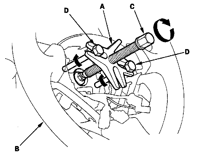 - If you thread the puller bolts (D) into the wheel hub more than five threads, the bolts will hit the cable reel and damage it. To prevent this, install a pair of jam nuts five threads up on each puller bolt.