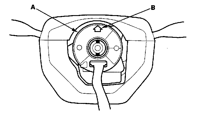 1. Before installing the steering wheel, make sure the front wheels are aligned straight ahead, then center the cable reel (A). Do this by first rotating the cable reel clockwise until it stops. Then rotate it counterclockwise about two and half turns. The arrow mark (B) on the cable reel label point should point straight up.