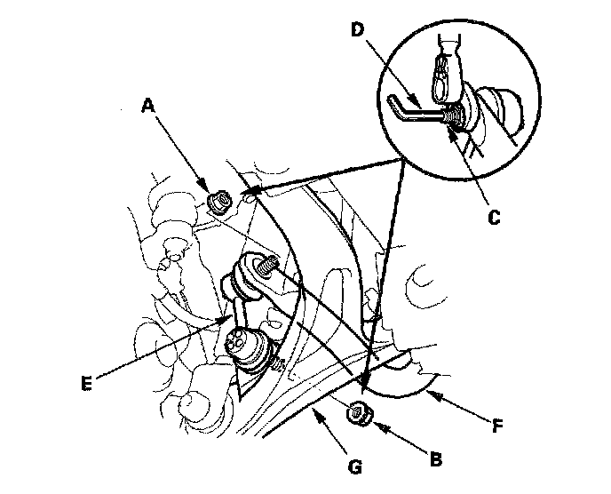 3. Remove the self-locking nut (A) and flange nut (B) while holding the respective joint pins (C) with a hex wrench (D), and disconnect the stabilizer link (E) from the stabilizer bar (F) and the lower arm (G).