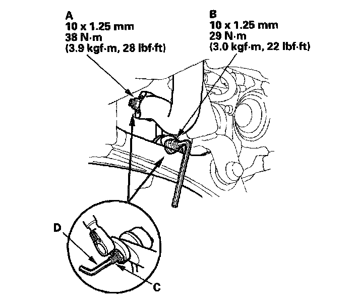 7. Tighten the self-locking nut (A) and flange nut (B) to the specified torque values while holding the respective joint pins (C) with a hex wrench (D).