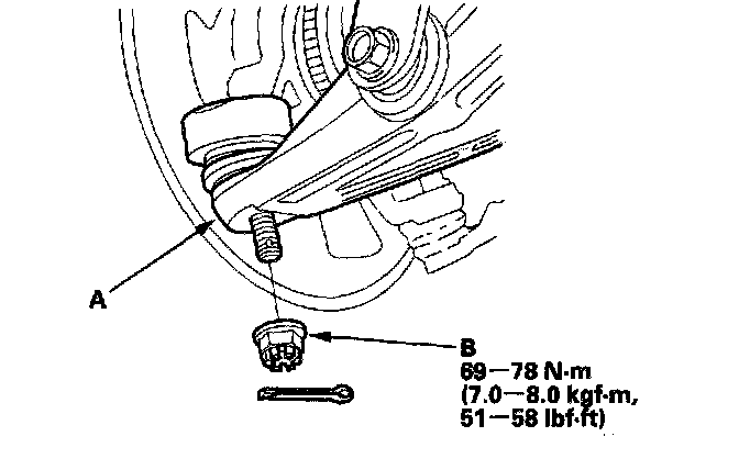 8. Install the ball joints onto the lower arms (A), then install the castle nuts (B) and new cotter pins.