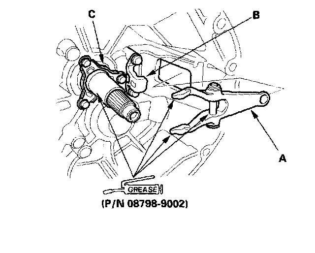 3. Apply super high temp urea grease (P/N 08798-9002) to the release fork (A), the release hanger (B), and the release bearing guide (C). Install the release fork into the opening in the clutch housing.