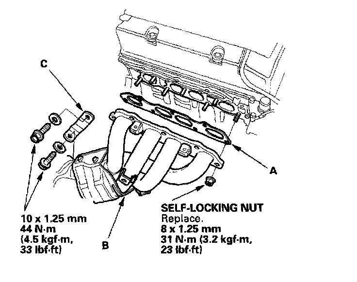 16. Install the gasket (A), exhaust manifold (B), and the exhaust manifold bracket (C).