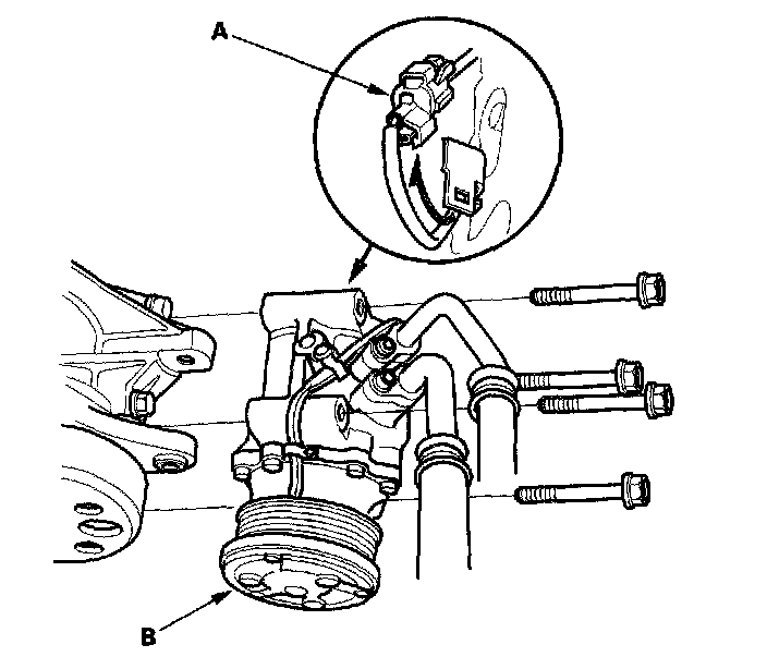 10. Disconnect the 1P connector(A),then remove the four mounting bolts and the A/C compressor (B).