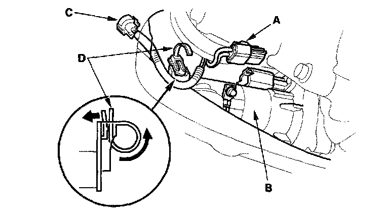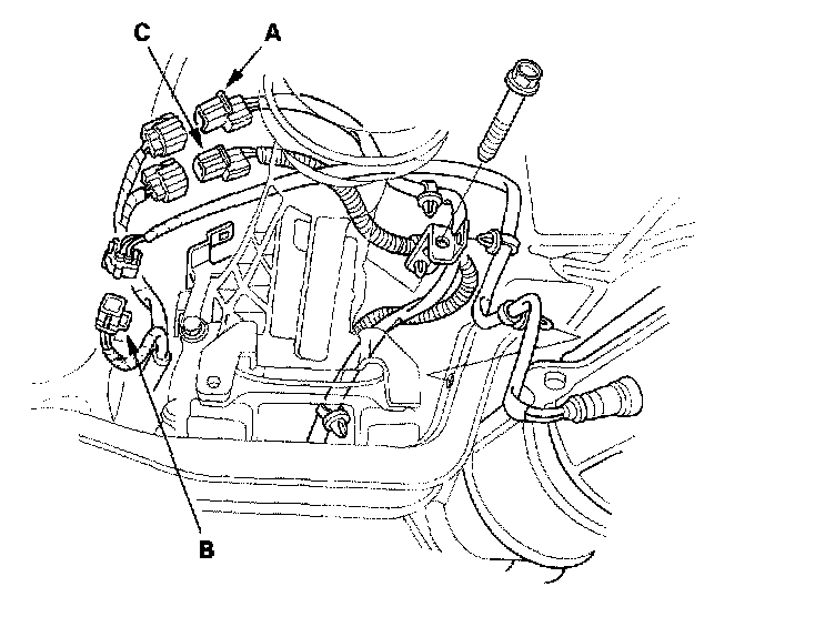 19. Disconnect the Heated Oxygen Sensor (HO2S) (A), secondary heated oxygen sensor (secondary HO2S) (B), and the back-up light switch (C) connectors, then remove the wire harness from the transmission.