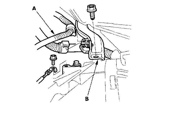 18. Remove the wire harness (A) and mounting bolt, then remove the intake manifold stay (B).
