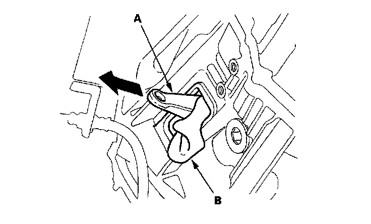 25. Pull out the release fork (A) from the release fork hanger. Wedge a shop towel (B) between the opening in the clutch housing and the release fork to hold the release fork in place.