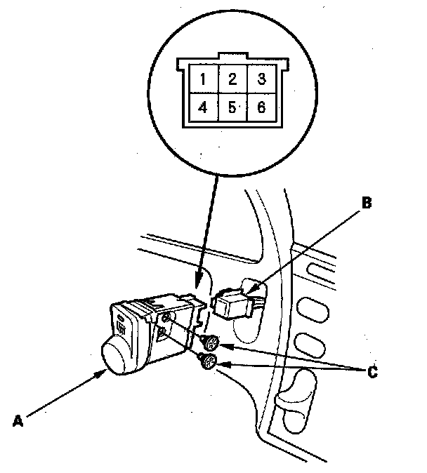 2. Remove the rear window defogger switch (A), then disconnect the 6P connector (B).