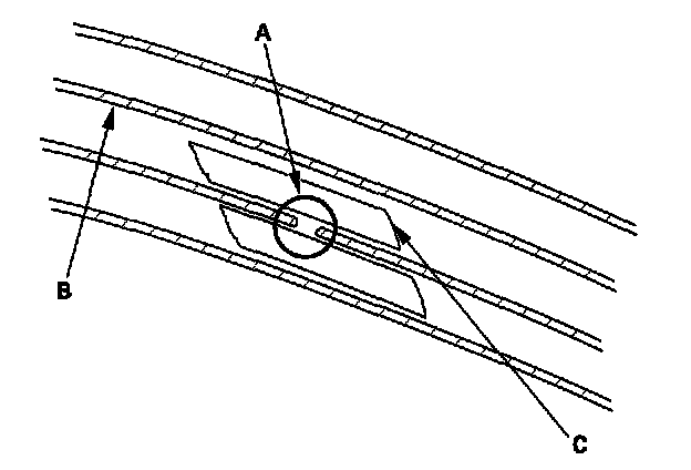 2. Carefully mask above and below the broken portion of the defogger wire (B) with cellophane tape (C).