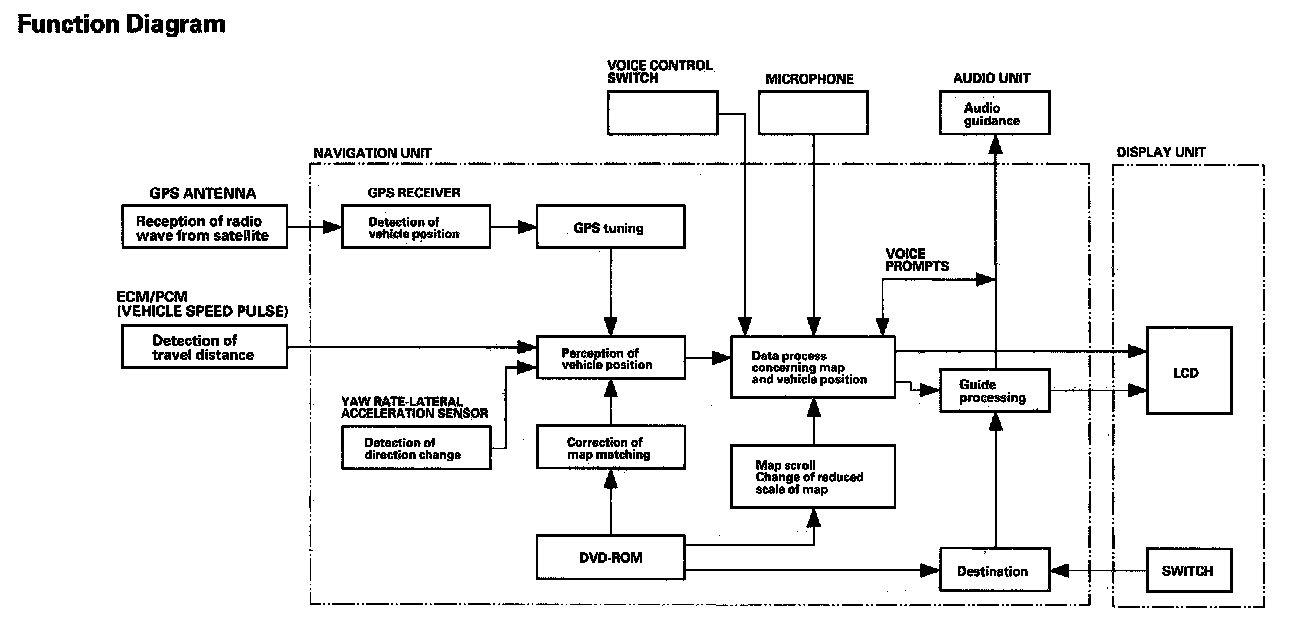 Navigation FunctionThe navigation system is composed of the navigation unit, the ECM/PCM (vehicle speed signal), the GPS antenna, microphone, voice control switch, audio unit, climate control unit, and the display unit.