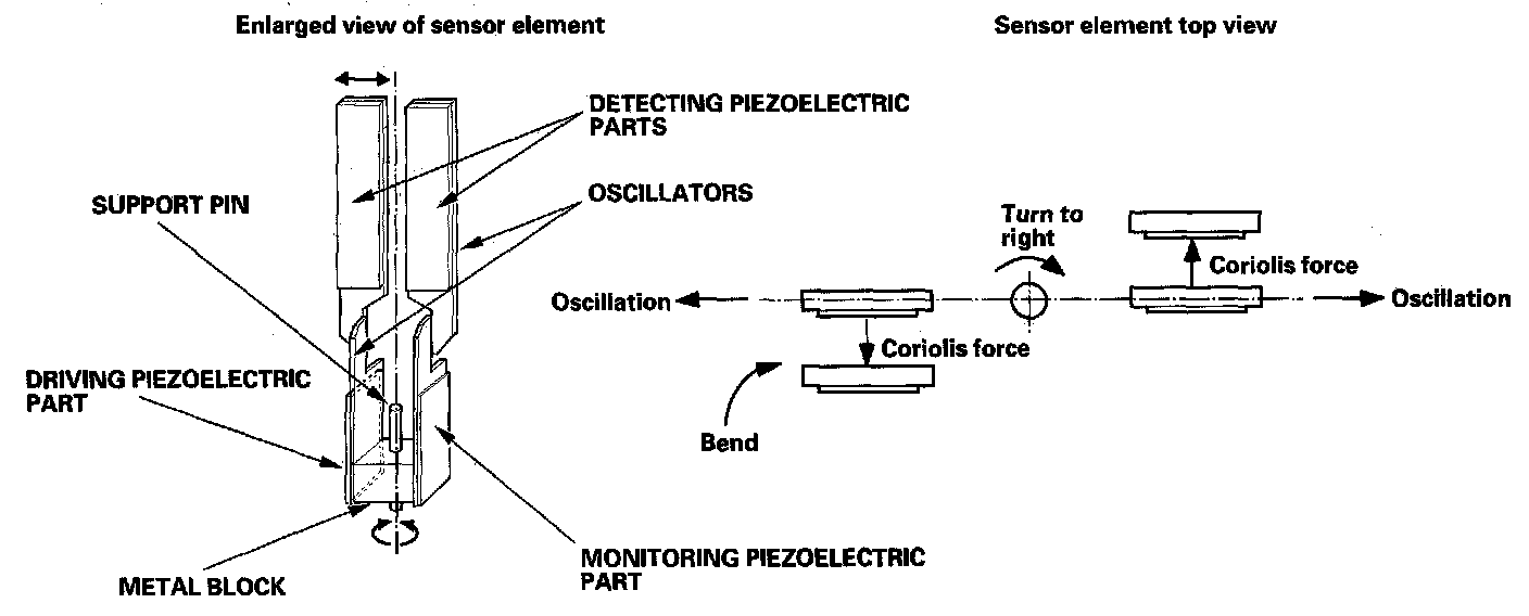 The piezoelectric parts have "electric/mechanical transfer characteristics." They bend vertically when voltage is applied to both sides of the parts, and voltage is generated between both sides of the piezoelectric parts when they are bent by an external force. The oscillation gyro functions by utilizing this characteristic of the piezoelectric parts and "Coriolis force." (Coriolis force deflects moving objects as a result of the earth's rotation.) In the oscillation gyro, this force moves the sensor element when angular velocity is applied.