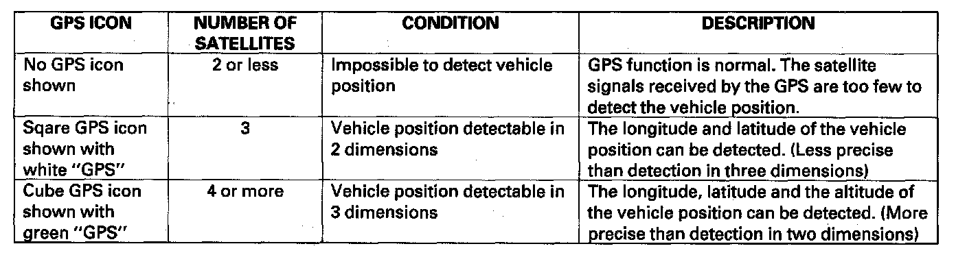 The global positioning system (GPS) enables the navigation system to determine the current position of the vehicle by utilizing the signals transmitted from the satellites in orbit around the earth. The satellites transmit the satellite identification signal, orbit information, transmission time signal, and other information. When the GPS receiver receives a signal from three or more satellites simultaneously, it calculates the current position of the vehicle based on the distance to each satellite and the satellite is position in its respective orbit.